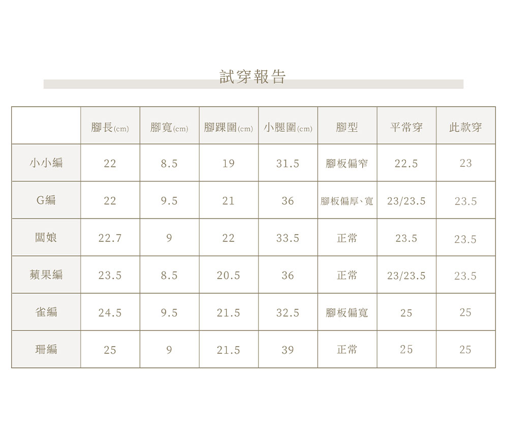 ● 因每人穿著感受、喜好習慣、身材比例不同,即使同樣的身高體重,選擇穿著的尺寸也可能會不同,試穿報告僅提供參考