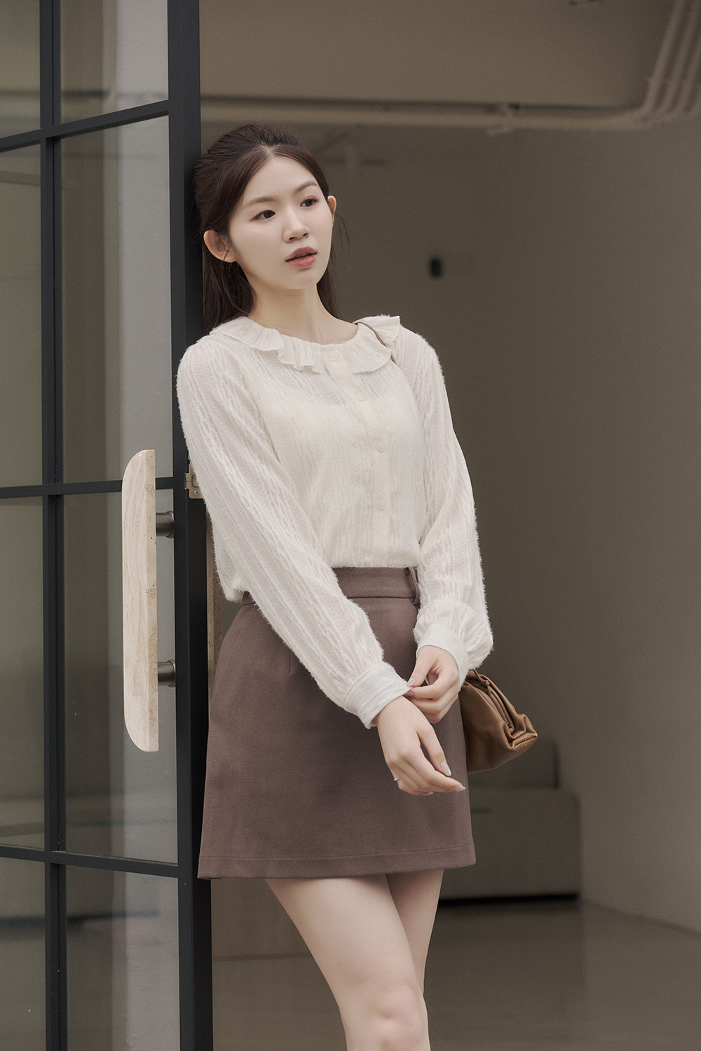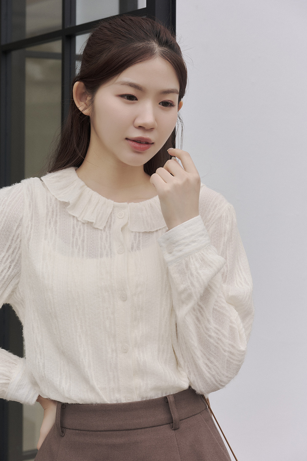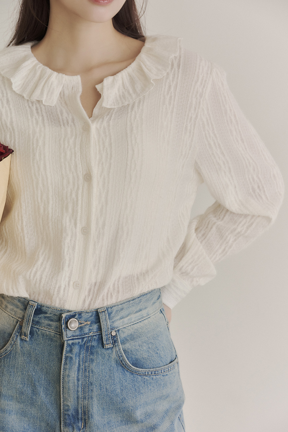 好久不見 荷葉領磨毛緹織襯衫