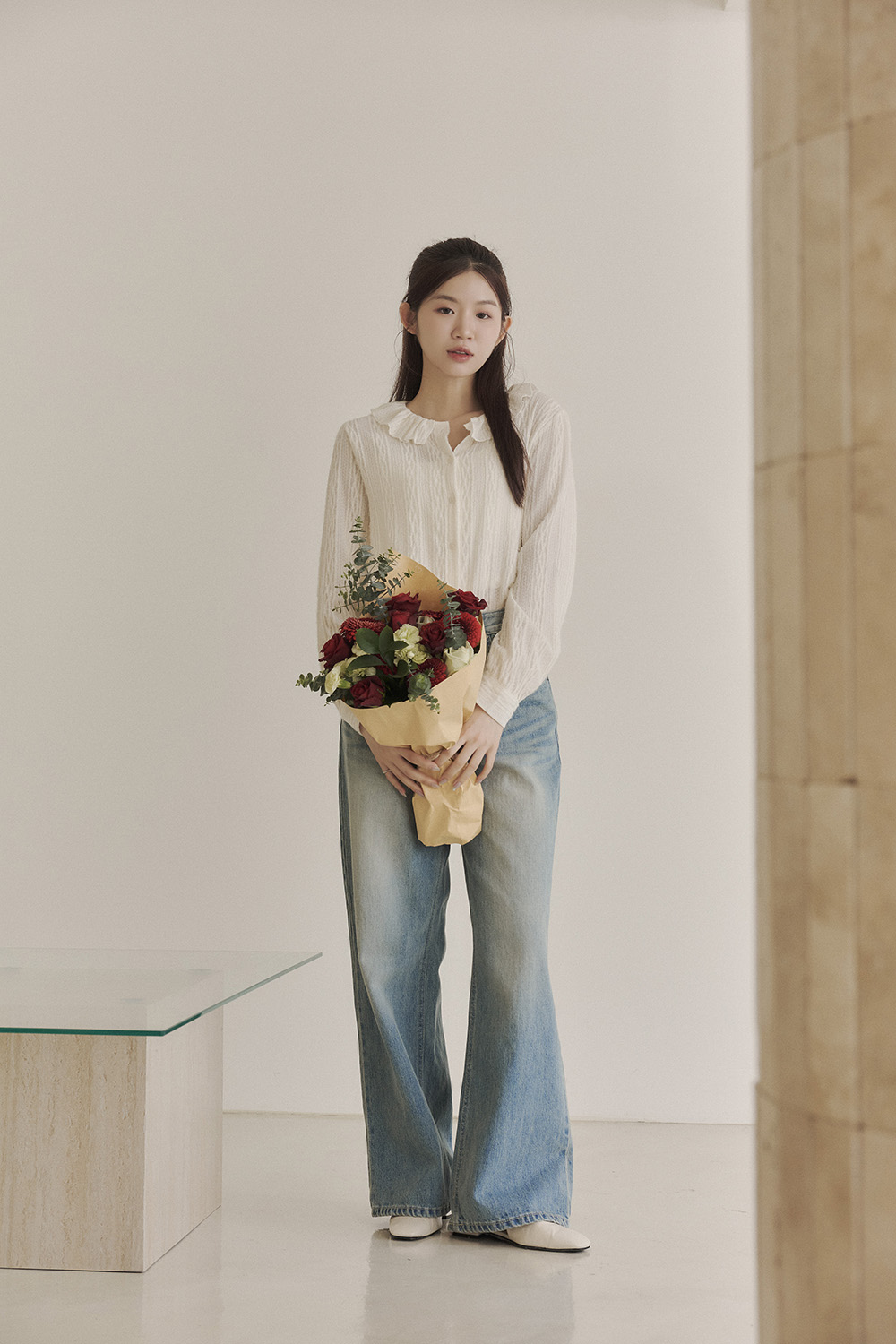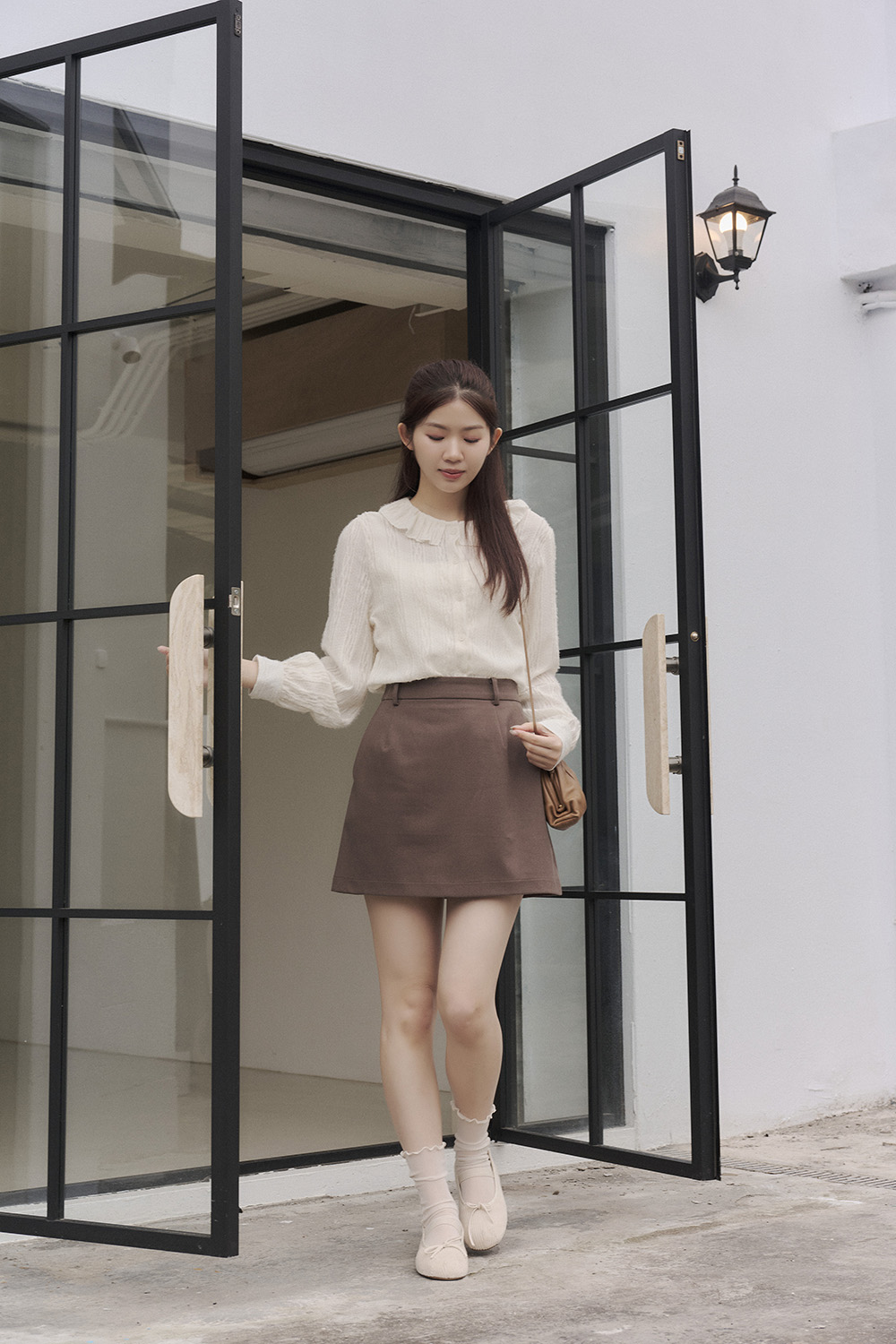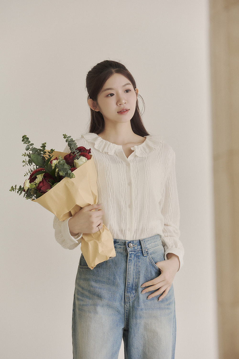 好久不見 荷葉領磨毛緹織襯衫