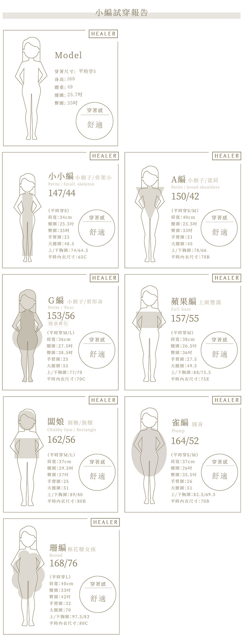 ● 因每人穿著感受、喜好習慣、身材比例不同,即使同樣的身高體重,選擇穿著的尺寸也可能會不同,試穿報告僅提供參考