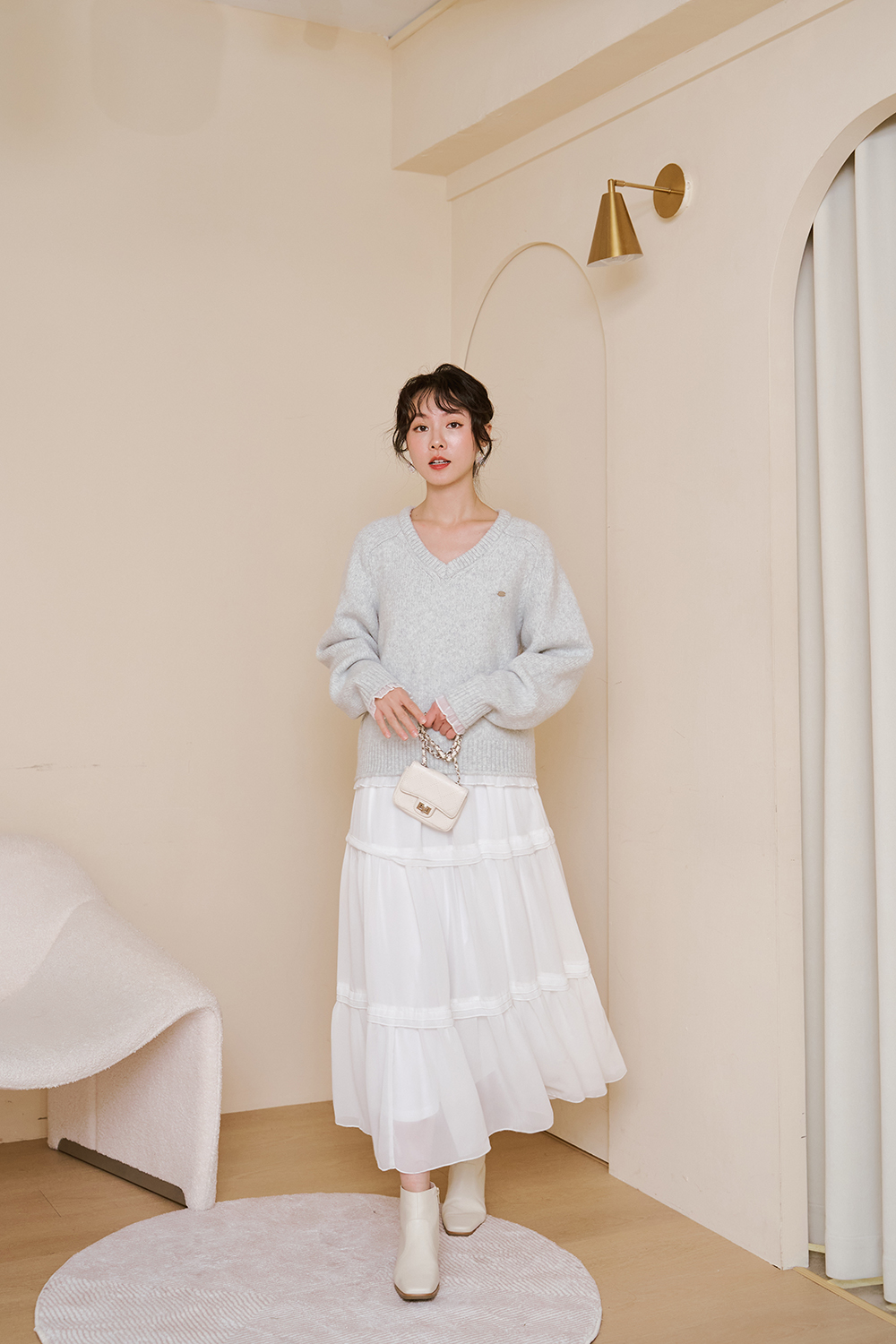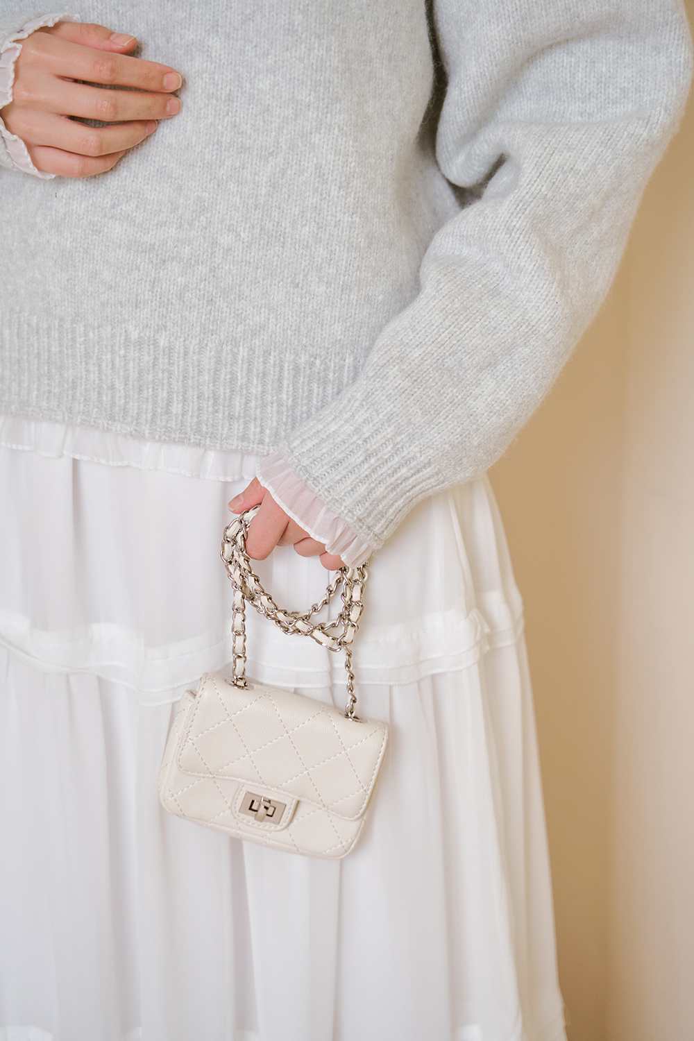 下襬跟袖口拼接雪紡紗滾邊  增加浪漫層次感 🤍