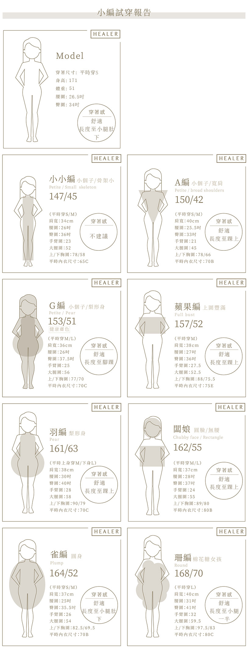 ● 尺寸表皆為平放測量,單位公分(cm)為主● 人工測量會因布料彈性、平整度、洗水工藝與起訖點等,與實際商品略有差距,一般布料誤差值±2cm、針織布料±5cm,為國際驗貨標準接受範圍,非瑕疵定義● 因每人穿著感受、喜好習慣、身材比例不同,即使同樣的身高體重,選擇穿著的尺寸也可能會不同,試穿報告僅提供參考● 建議可測量平時穿著的衣物做比對會更為準確